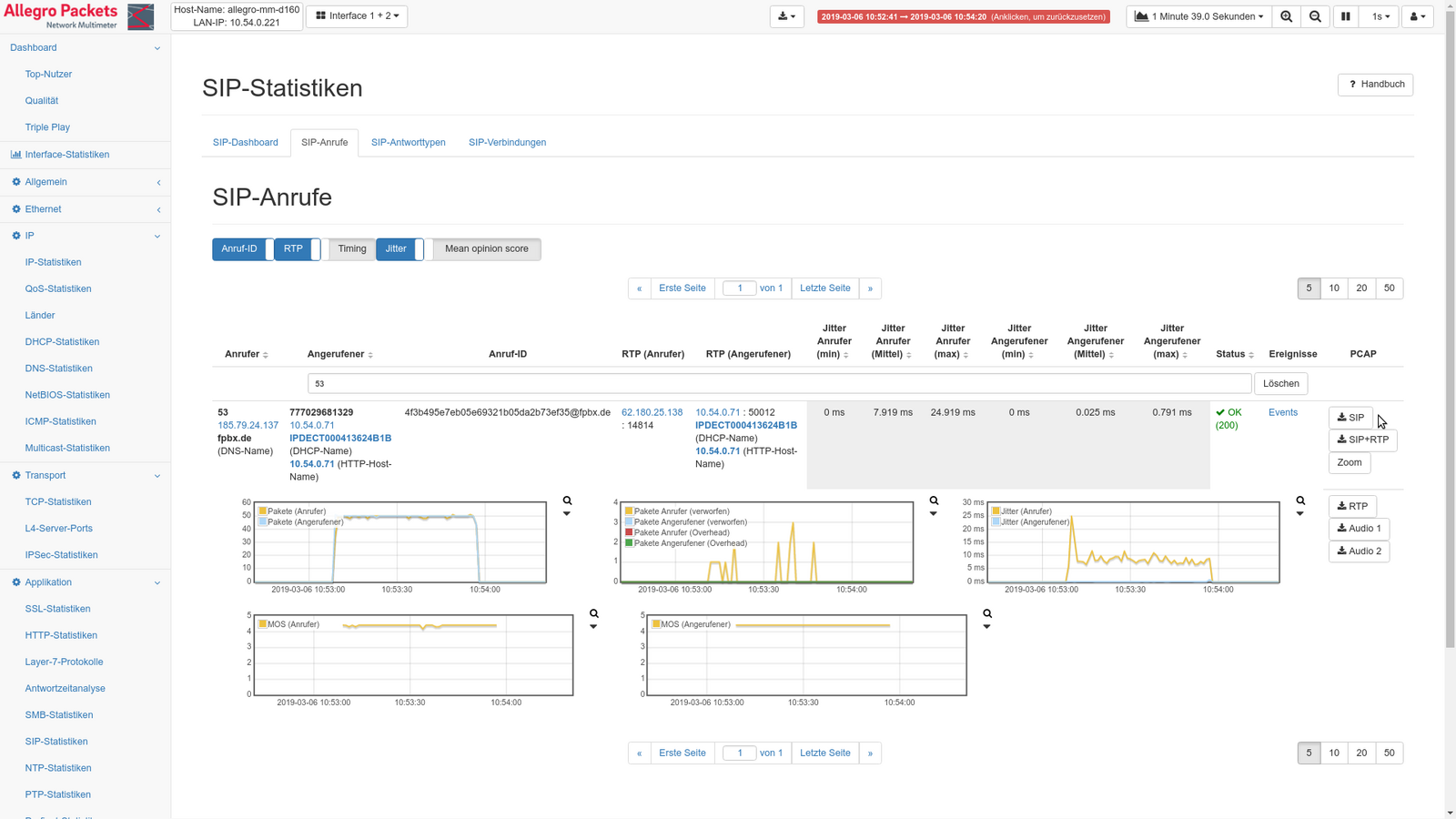 Will man z.B. dem Problem auf den Grund gehen, warum das VoIP-Gespräch letzte Woche Mittwoch so abgehackt war, navigiert man zum SIP-Modul, stellt den gewünschten Zeitbereich ein und sortiert die Anrufe aus diesem Zeitbereich nach Jitter oder filtert Sie direkt nach Telefonnummer. Den problematischen Anruf kann man nun per Pcap-Download zur weiteren Paketanalyse mit Wireshark downloaden.