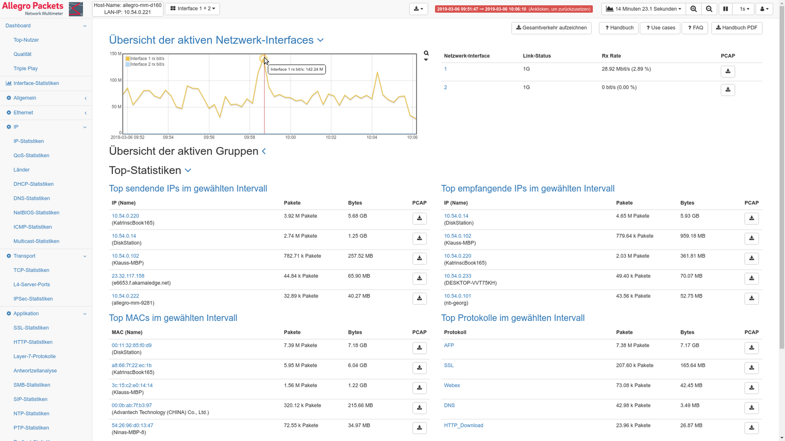 Die Capture-Funktion ist in allen Analyse-Modulen des Allegro Network Multimeter integriert. Beginnend vom Dashboard, wo man einen ersten Überblick über die wichtigsten Parameter des aktuellen Netzwerkverkehr erhält, kann man sich durch die verschiedenen Layer navigieren und über die Zeitleiste und Graphen immer genauer zum Problem vordringen. In den meisten Sektionen des User-Interface sieht man den Pcap-Download-Knopf, mit dem man den angezeigten, selektierten Netzwerkverkehr ganz einfach als Browser-Download capturen kann, egal, ob man z.B. ein Pcap von den MAC-Statistiken oder ein Pcap von den HTTP-Protokollen downloaden möchte.
