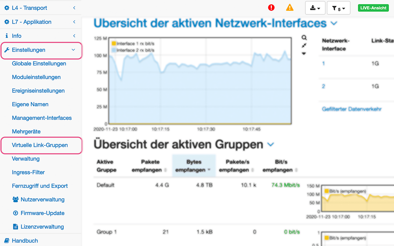 Das Feature "Virtuelle Link-Gruppen" ist im Dashboard unter "Einstellungen" → "Virtuelle Link-Gruppen" zu finden. Einen detaillierten Konfigurations-Guide finden Sie im Produkt-Wiki.