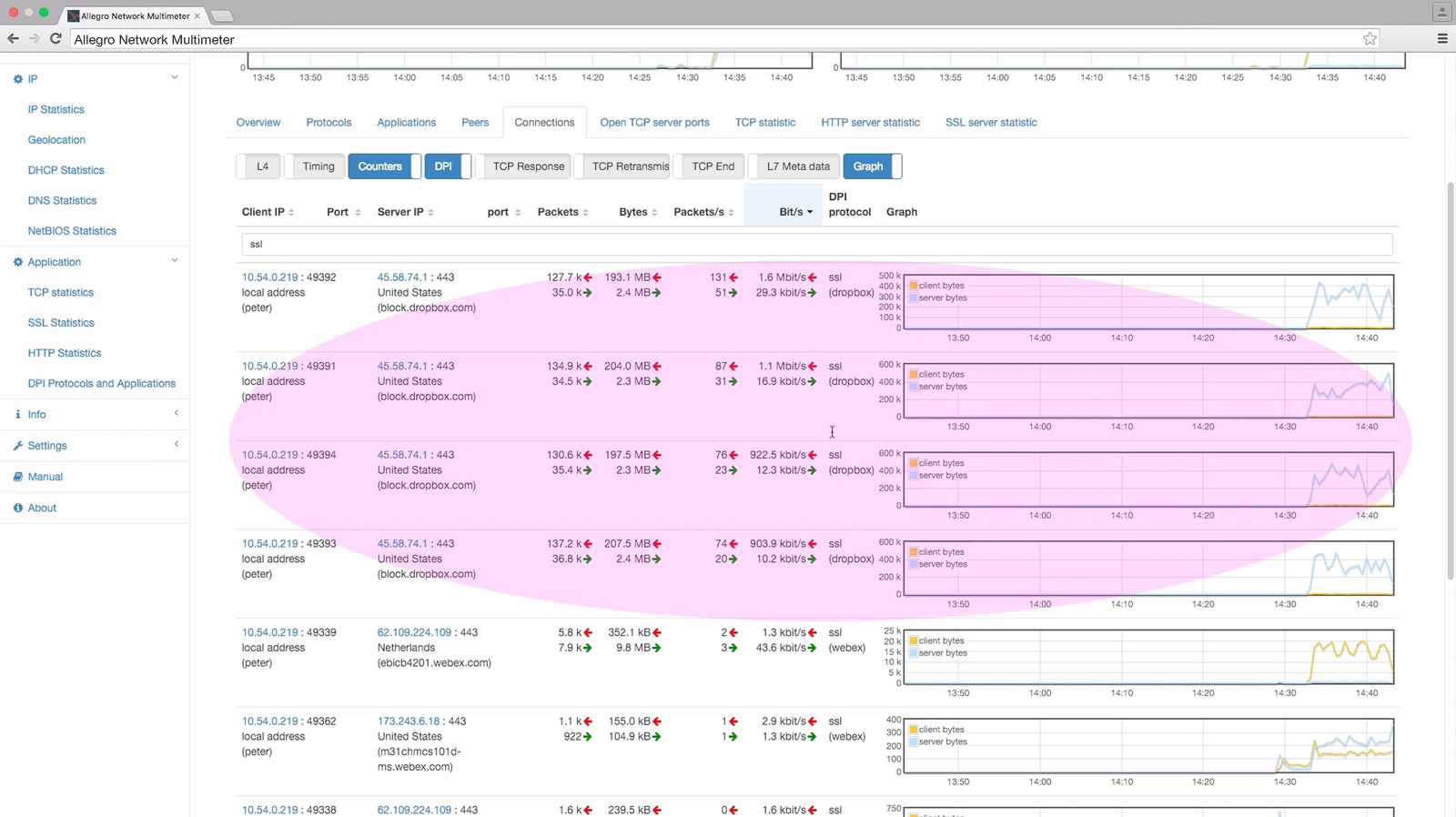 Es folgt eine Untersuchung aller IP-Paare ("Peers") der Webex-IP. Als IP-Partner wird nur eine IP gefunden, die mit der Webex-IP kommuniziert hat und einen DHCP-Namen ausweist, der dem Mitarbeiter zugeordnet werden kann. Die Untersuchung der IP-Informationen des Mitarbeiters zeigt seine Protokolle innerhalb der letzten Stunde. Um eine gute Übersicht dieser Verbindungen zu haben, ist eine Stundenauflösung ratsam. Hier wird sofort das meistbenutzte Protokoll in der letzten Stunde sichtbar: SSL mit mehreren Hundert Megabyte. Aktuell hat es einen Durchsatz von 8,8 MBit/s und nur 65 Kbit/s Durchsatz für Webex. Ein Klick auf den Menüpunkt „Verbindungen“ erlaubt weitere Erkenntnisse zu diesem SSL-Verkehr. Hier kann nach SSL gefiltert und nach Bit/s sortiert werden. Die Ursache für die schlechte Webex-Verbindung wird nun deutlich. Es gibt vier aktive Dropbox SSL-Verbindungen zu block.dropbox.com, jeweils mit 1 - 2 MBit/s Verkehr.