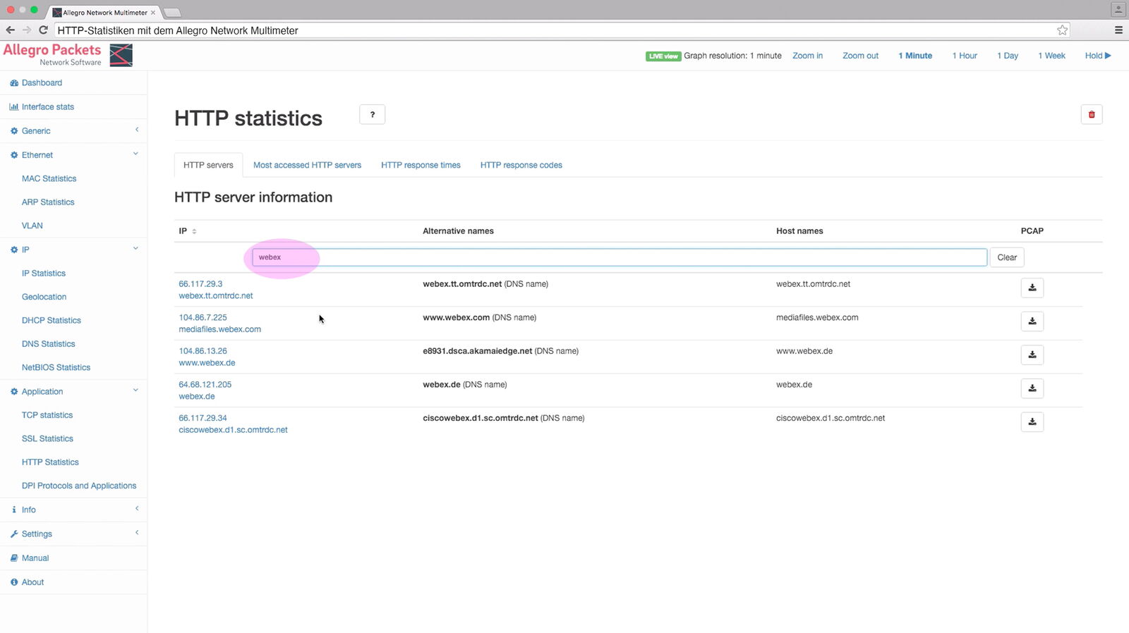 In unserem Fall hat der Link einen Durchsatz zwischen 5 MBit/s und 20 MBit/s. Um dem besagten Problem auf den Grund zu gehen, wird die IP-Adresse des Rechners des Mitarbeiters benötigt. Ist diese nicht bekannt, stehen verschiedene Möglichkeiten zur Verfügung, diese herauszufinden. Der Mitarbeiter könnte, wenn möglich, diese nennen, nachdem er sie im Rechner ausfindig gemacht hat. Einfacher ist es, mit dem Allegro Network Multimeter nach seinem Device zu suchen. Damit können die IP-Adressen gesucht und identifiziert werden, die auf den Webex-Server zugegriffen haben. Dazu gibt es wiederum verschiedene Möglichkeiten. Alle IP-Adressen nach dem Protokoll Webex zu durchsuchen, stellt eine Variante dar. Die Alternative ist, anhand der Verbindung vom Webex-Server seine IP herauszufinden. Dazu wird die HTTP-Statistikseite unter dem Menüpunkt „L7 - Applikation“ des Allegro Network Multimeters geöffnet. Die Freitextsuche ermöglicht die Filterung aller HTTP-Server nach dem Suchwort "Webex“. Die HTTP-Server werden nun angezeigt und ein schneller Klick auf eine IP zeigt detaillierte Informationen zur Webex-IP.