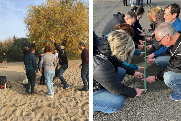 During our hike, we make several stops to use the time for some teambuilding games. Before each game, we start anew by forming individual groups out of different team members. The purpose of the individual tasks is to collectively develop ideas and strategies. Creativity is needed here. Those who are skilled in tying knots can apply their know-how in the following challenge. Tom doesn't need to be told twice, so he starts leading his team members through each knot piece by piece, or string by string. In total, five knots are to be tied between the team members, who each form a chain by holding a rope in their right and left hands. In the next game, it turns out that our colleague Georg is a true puzzle professional. He solves the three puzzles in record time. Finally, we have to estimate 400 grams as accurately as possible with objects lying around. For Soumar's team, this task is easy - with a total of 403 grams on the scales, they win this game. "I am working in production, I can do it!" he proudly announces.