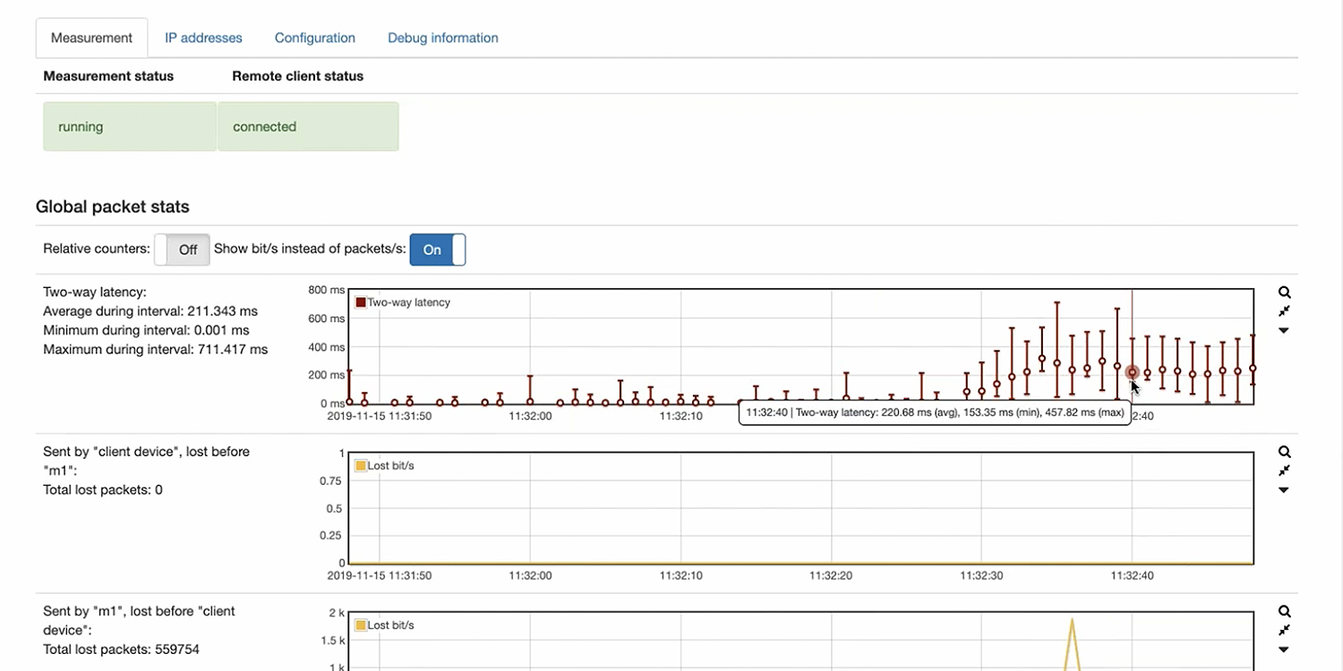 Once the download is complete, we can use the Allegro Network Multimeter's many debugging options to investigate the case retrospectively. For example, the web interface of the analysis solution shows which IP address had the highest data transmission or how many packets were lost in which direction. A diagram shows all the packets that were seen on the remote device but are missing on the main device. This means that these packets were lost on the way to the primary device. For example, in the time interval of the download, 47,000 packets were transmitted, but only 46,000 arrived at the remote end.