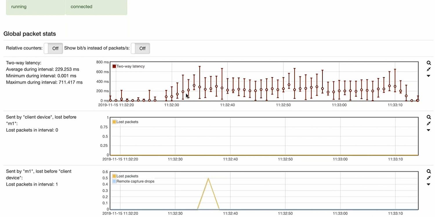 The web interface provides us with information about latency. The first graph shows the latency measured from the primary device to the remote device and back. In our experiment, we see latencies of 1 to 3 seconds; a two-way latency is measured. The Allegro Network Multimeter's web interface shows the average, minimum and maximum time results in the dashboard.