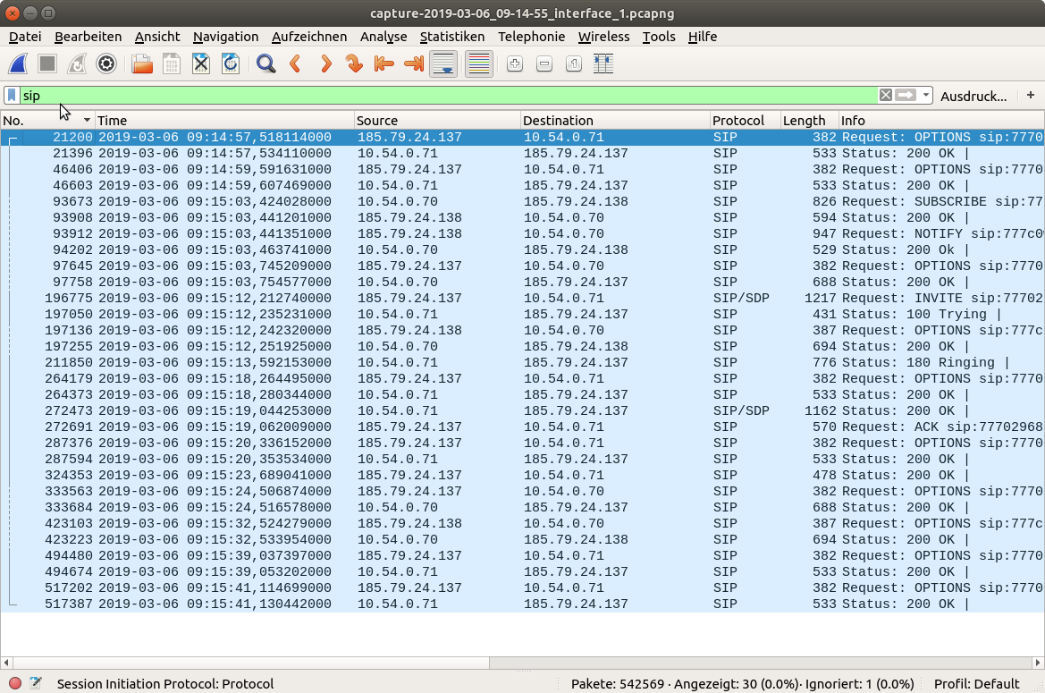 The simplest use of display filters is to reduce traffic to a single application, a specific protocol, or the exact specification of a data field. To do this, you can either use the menu (Analysis->Display Filter) to select, for example, the HTTP protocol, which will limit the view to all HTTP entries, or insert the desired filter value directly into the filter toolbar. If you want to see only all SIP connections, you just have to type 'sip' in the input field and confirm with 'Enter'