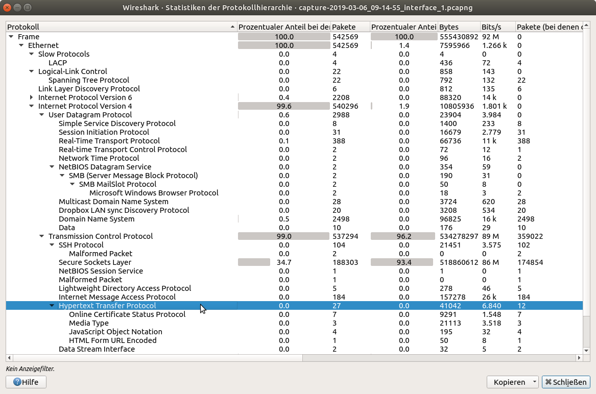 Overall, the protocol hierarchy technique is a scaleable way to get an overall view of a pcap file. The protocol hierarchy is often the starting point for further analyses, because here indications of unexpected traffic or errors come to light, such as unexpected protocols or unexpected data ratios of individual protocols. It is often not the presence of a protocol that generates attention, but its relative proportion.