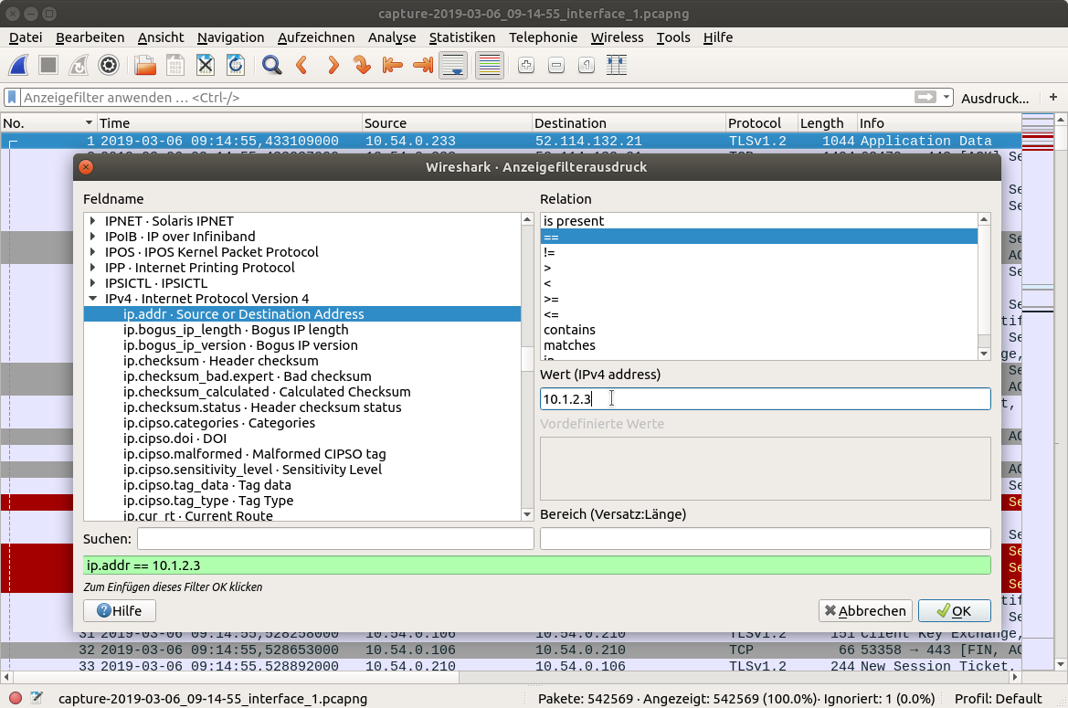 As a skilled Wireshark user, expressions can be applied freely from memory. Initially, it is easier to use Wireshark's Expression Builder dialogue box to add an expression to the display filter. This dialogue box opens when the term 'Expression' is right-clicked in the filter toolbar. Here, predefined operators can be selected and linked. To check if the selected filter is correct, the filter toolbar turns green. If the filter is invalid, the area is highlighted in red.