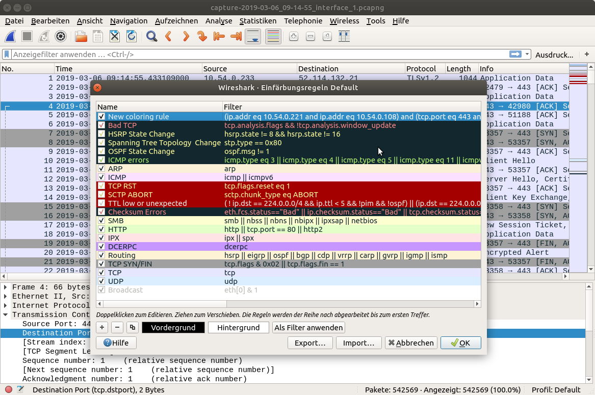 In addition to the filter functions, Wireshark has a customizable colour coding system. By default for example, all UDP packets are marked in blue, standard TCP transfer in purple and HTTP in green. These colour codes help an administrator to identify the packet types at a glance. User-defined colour rules can be assigned to their own profile and saved, complete the system. Both text and background colours can be customized.