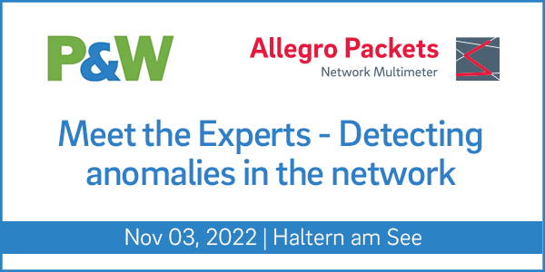 Our partner P&W invites you to "Meet the experts" in Haltern am See on 3 November. Participants will experience exciting presentations from experts about "Detecting anomalies in the network". Allegro Packets`s expert Oliver Huber will discuss "Intuitive Network Troubleshooting - Examining Data in Real Time". Individual appointments with the experts as well as networking and exchange opportunities will round off the day.