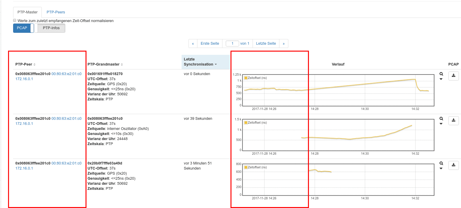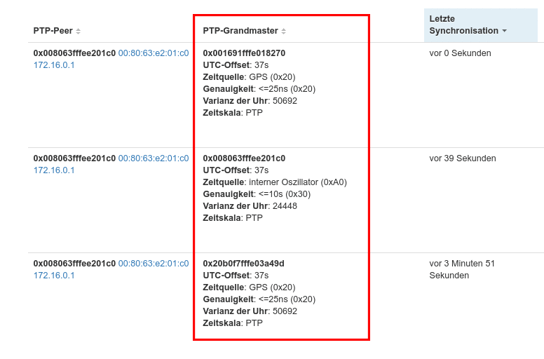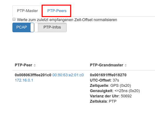 In Step 2, the Allegro Network Multimeter displays all detected PTP peers. The statistics include the time at which someone last synchronized with the master and who receives the time via PTP. The Allegro Network Multimeter also allows the synchronization of packet timestamps - via PTP instead of NTP. If the timestamps need to be more accurate than PTP, synchronization via GPS using an expansion card is possible.