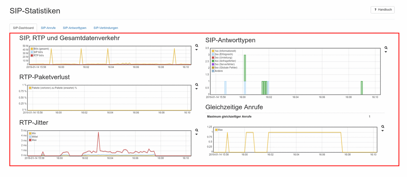 The Allegro Network Multimeter displays all significant quality metrics such as packet loss and jitter globally. In addition, it displays all successful and unsuccessful SIP calls according to error code via a graph and allows SIP errors to be narrowed down to a single point in time. In addition, all simultaneous telephone calls are displayed, e.g. to detect an overload caused by too many simultaneous telephone calls.
