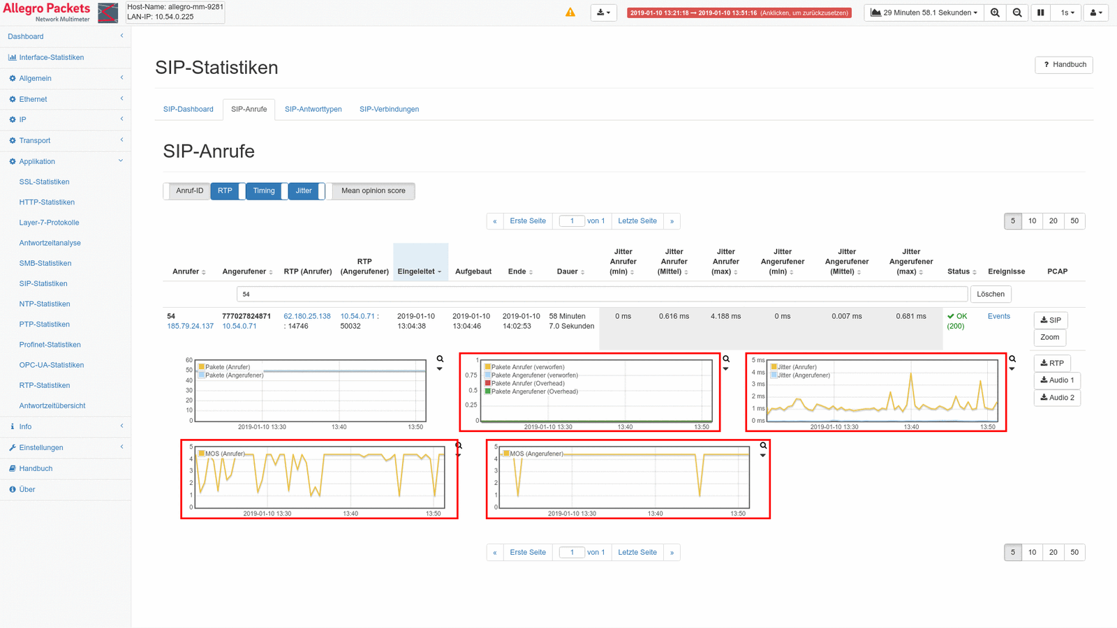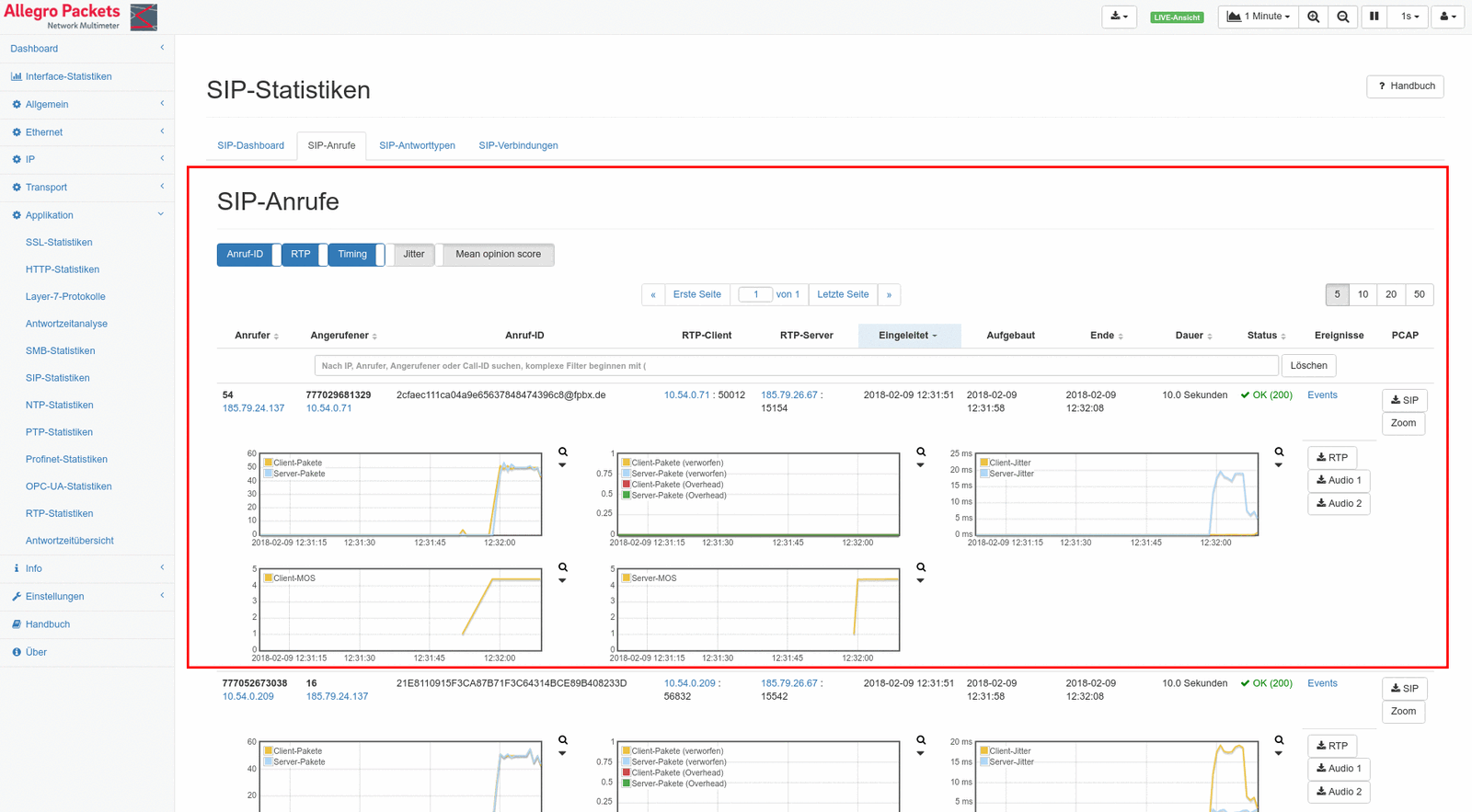 All SIP calls are clearly displayed in a table. All calls can be easily sorted and filtered according to call IDs, phone numbers, IP addresses, call IDs and jitter or MOS values. The SIP recognition automatically correlates the RTP connection belonging to the SIP call and displays this graphically with packet rate, packet loss, MOS value and jitter. The SIP and RTP connections can be extracted as a pcap.