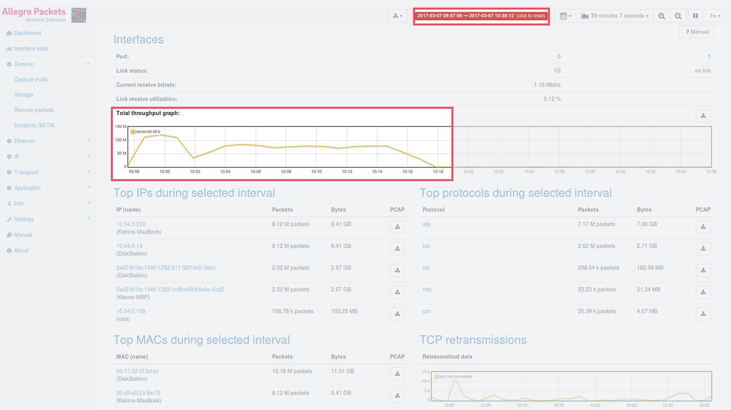Instead of the most active IP addresses and protocols with the highest traffic in the past minute, the lists ‘Top IPs’ and ‘Top protocols’ now show (as their names suggest) the top IP addresses and the top protocols in the selected period. Note that one IP address and one protocol caused almost all the traffic in this interval. It is hence already evident that a specific user was responsible for an enormous amount of network traffic in this period.