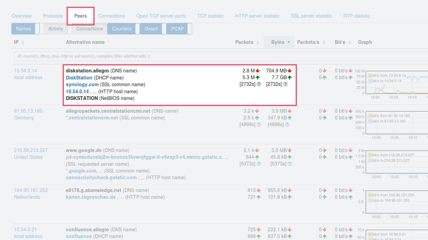 Click on the top IP address to open the detailed view. The name of the user’s PC, its MAC address, and other information will be displayed. By clicking again on the ‘Peers’ tab, all the connections originating from this user are displayed in detail. It turns out that once again the connection to just one peer – in this case a file server named ‘diskstation’ – was responsible for nearly all the traffic.