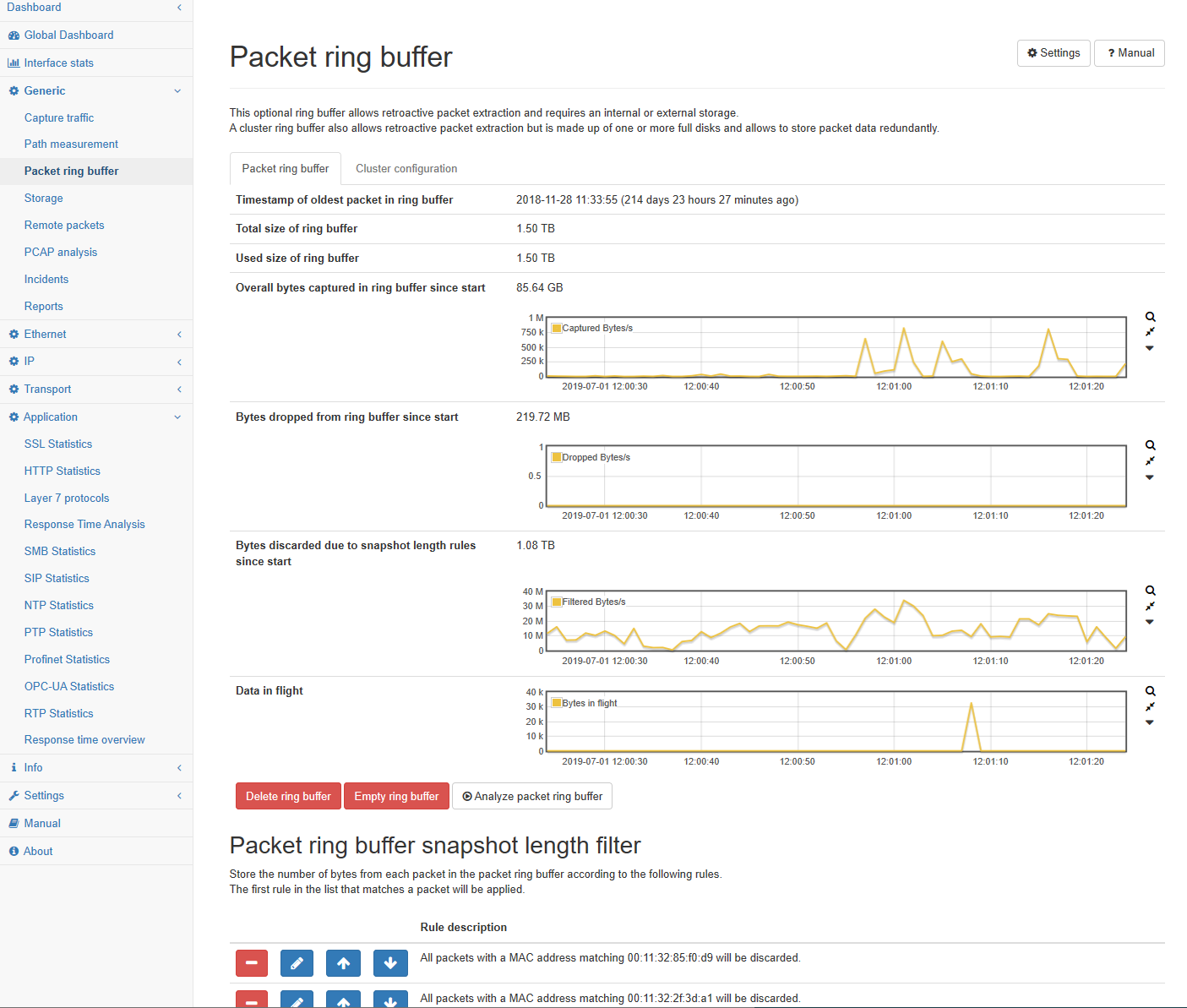 The »packet ring buffer« statistics page displays information about the use of the ring buffer and multiple graphs of the stored traffic (Figure 2). Filters can be used to set which packets are stored in the ring buffer. By default, all packets are stored.