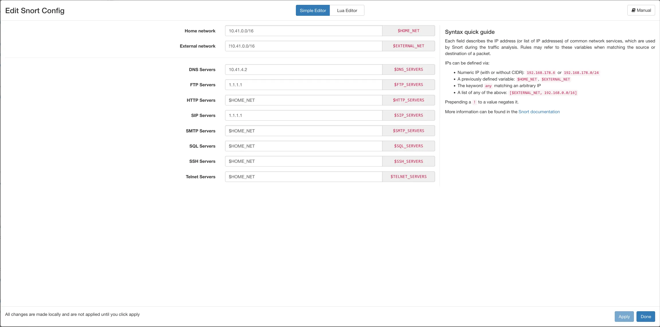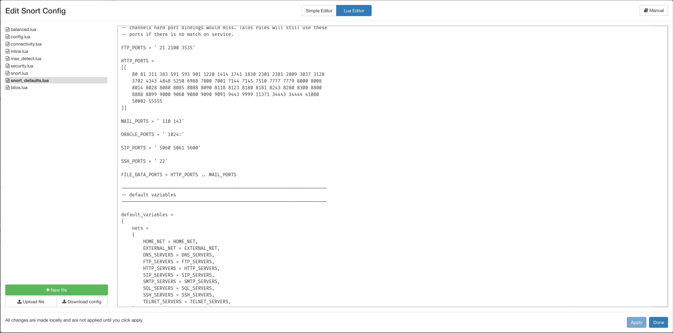 Section titled “Lua editor”This is the advanced configuration mode for Snort, and is toggled by clicking the appropriate button at the center top of the modal.