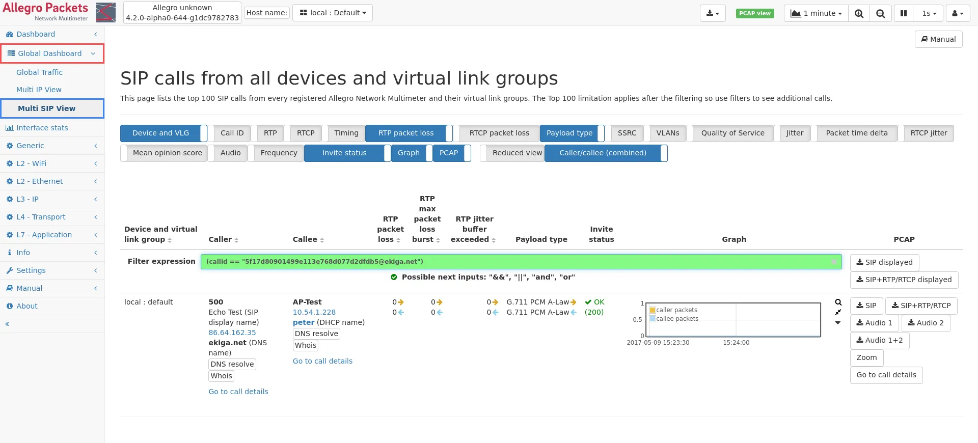 The Multi SIP view module shows the Top 100 SIP calls for all multi devices and their virtual link groups.