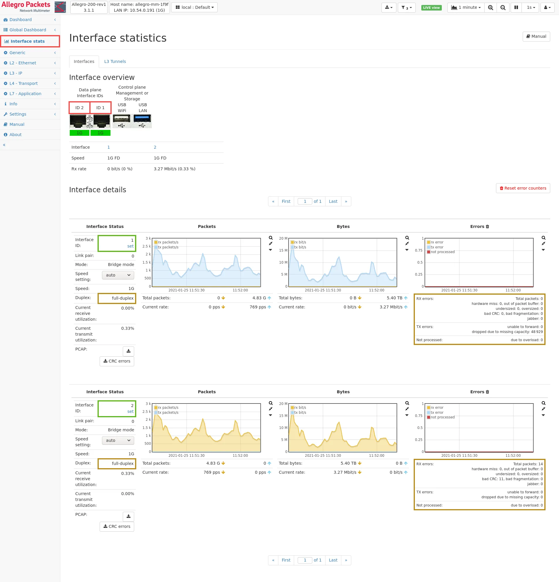 - In case the Allegro Network Multimeter operates in bridge mode and two mutual interfaces do not have the same link speed and duplex, a warning will be shown below the Duplex status for both interfaces.
