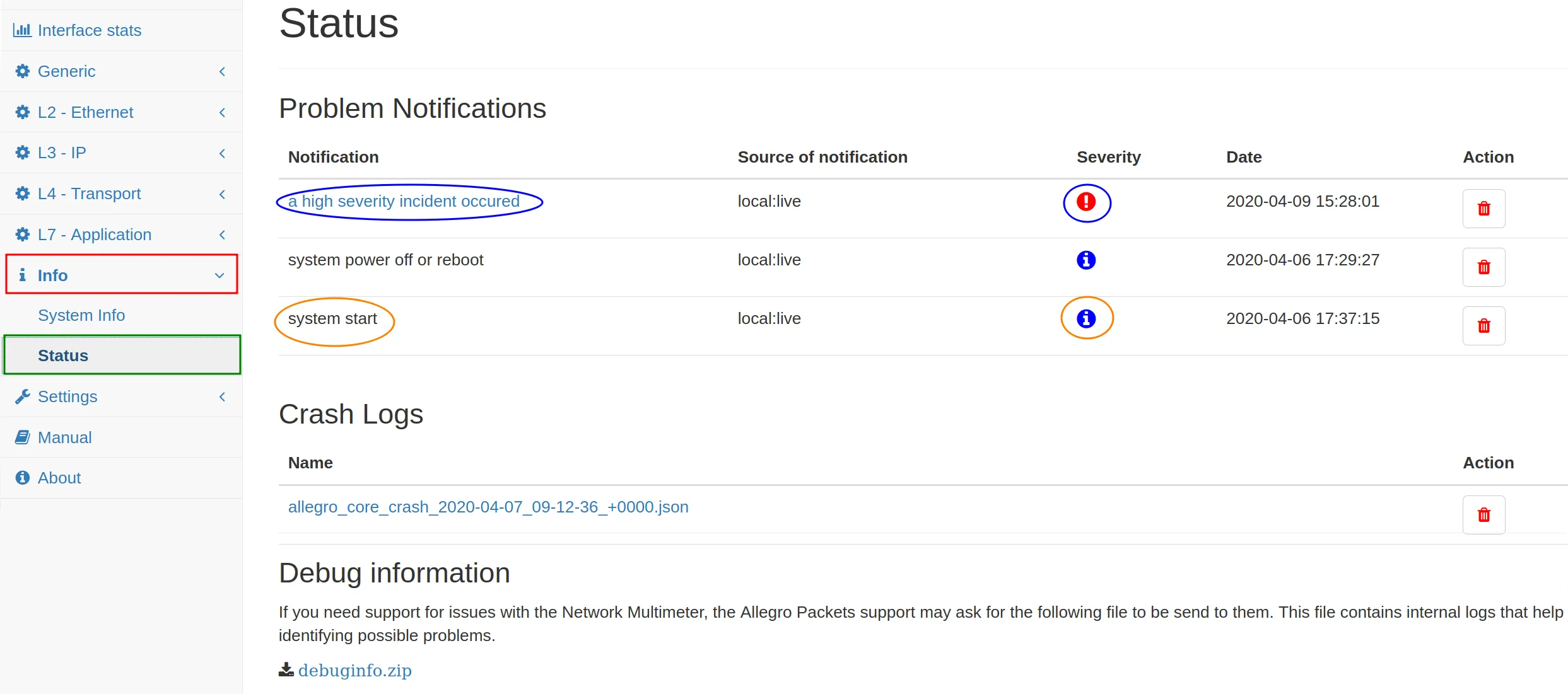 The Status page lists possible problems, which occurred during packet processing. This includes bypassed packets in case of system overload, core restarts, and other problems. In case of crashes or performance issues, crash logs and performance snapshots are shown which can be downloaded and sent to Allegro Packets Support for analysis.