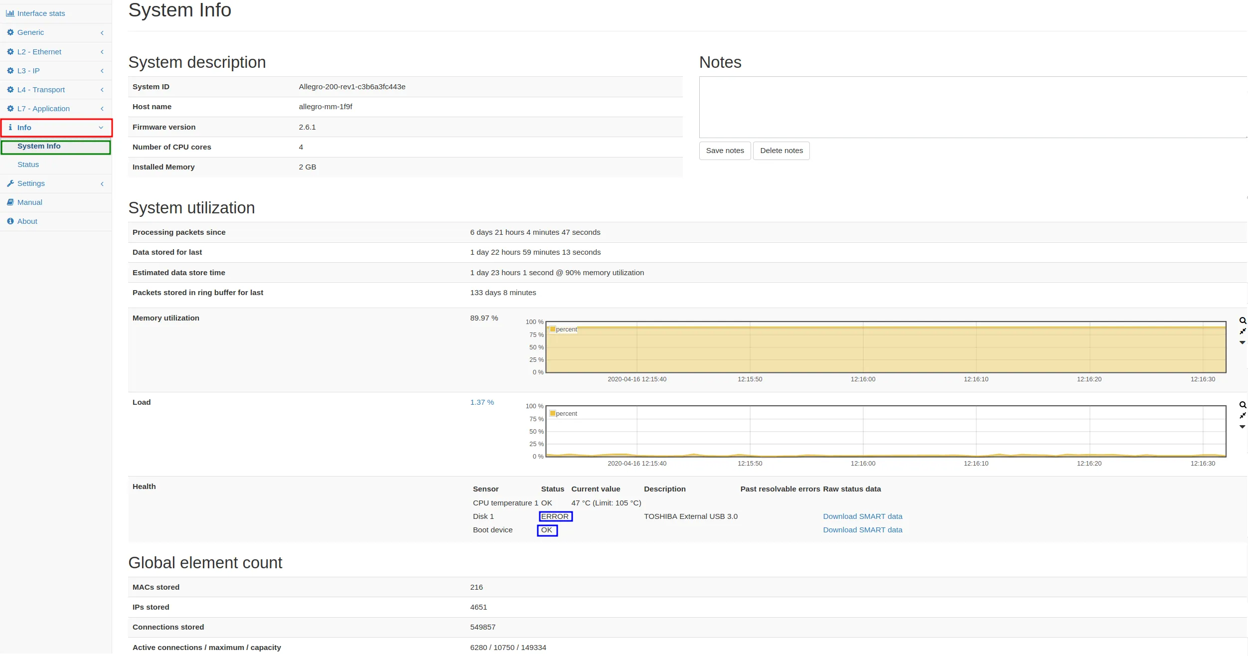 This page contains multiple sections about different parameters of the system. The System description describes system parameters such as the Firmware version and the installed CPU cores and memory. There is also a Notes text box which can be used to save some system-specific notes and optionally show them after logging in (displayed in a modal dialog after login). These notes are also visible on the Global traffic dashboard when the system is used as a remote multimeter from another device. The System utilization summarizes statistics about the current utilization which is dependent on the actual network traffic.
