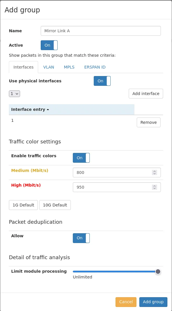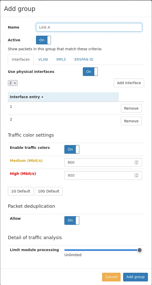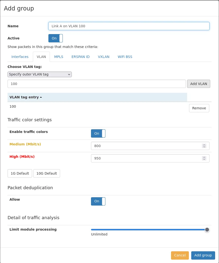 The Virtual Link Group allows grouping traffic in virtual links on the Allegro Network Multimeter. By default, the Allegro Network Multimeter aggregates all traffic on all interfaces and the ingress interface makes no difference to the analytics. The Virtual Link Group allows the user to split the traffic into separate groups.