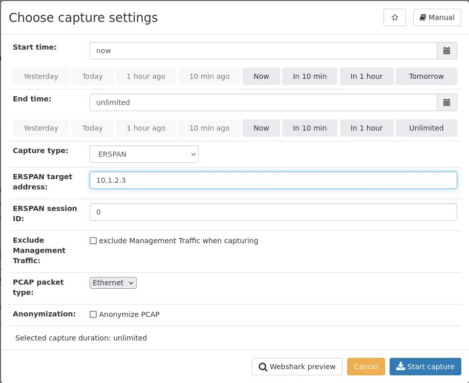 Once this is configured, you can initiate a live capture with or without filters with the capture button. Please select the ERSPAN as the capture type and fill the receiving IP address.