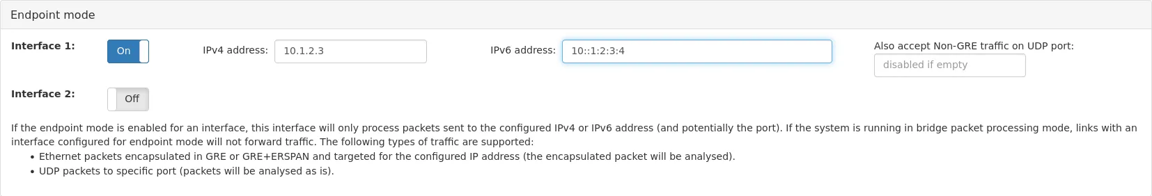 For each interface, both an IPv4 and an IPv6 address can be configured. It is possible for both addresses to be active at the same time. It is also possible to only configure one of the addresses and leave the other field empty, in which case the ERSPAN mode will only apply to the configured address. If the IPv4 address is configured, the interface will respond to ARP requests for the IPv4 address. If the IPv6 address is configured, the interface will respond to Neighbor Solicitation messages for the IPv6 address.