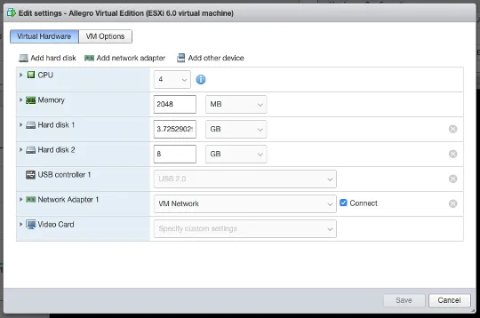 Section titled “Packet ring buffer and PCAP storage”For the ring buffer to work, you must add a Hard disk 2 virtual disk (or more) to the Allegro Virtual Edition. To do so, with a turned off VM, press Edit in the VMware ESXi host and add a new (high speed) HDD.