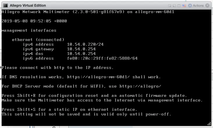 Section titled “Powering on”Power on the virtual machine when the import has been successful. The Allegro Virtual Edition will boot, prepare the installation and reboot once. The VM will seek for an IP address via DHCP on the management port. Check the screen output for an assigned IP address.