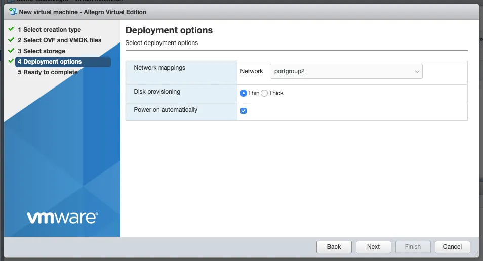 The deployment options allow you to select the network mapping for the management port and the disk provisioning.