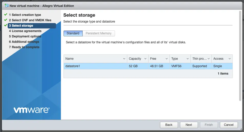 Select your data storage (20 GB is enough) for the Allegro. This storage will be used as the boot partition and to store the configuration of the Allegro Virtual Edition.
