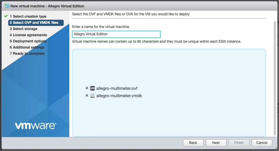 Press Next, use a preferred name for the Allegro and drag/drop the ovf and vmdk files into the window (as seen in the picture below) and press Next.