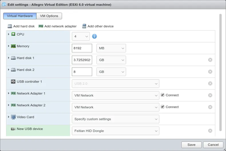 Section titled “Install USB License dongle”If the Allegro Virtual Edition is shipped with a USB License dongle, plug the dongle into an unused USB port of the VM host. The dongle must be connected to the virtual machine. When powered off, press Edit in the VMware ESXi host and click on Add other device. Choose USB device. A new entry on the bottom of the hardware list appears. Please select a Feitian HID Dongle or similar.