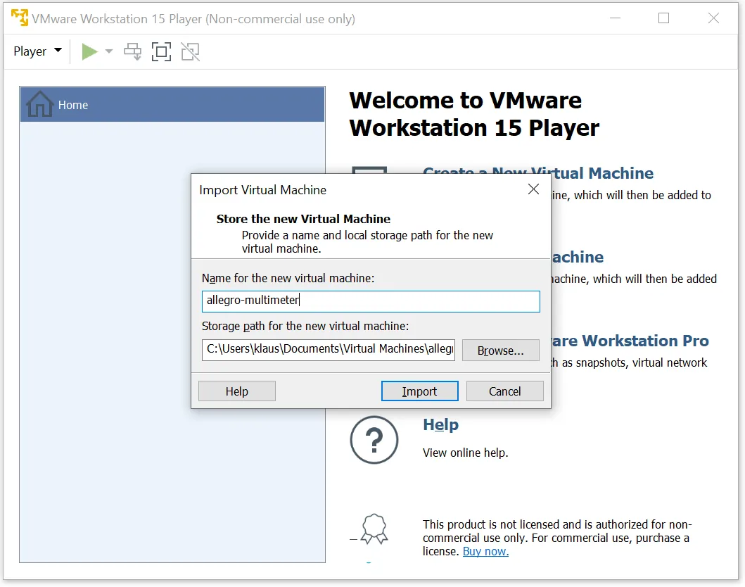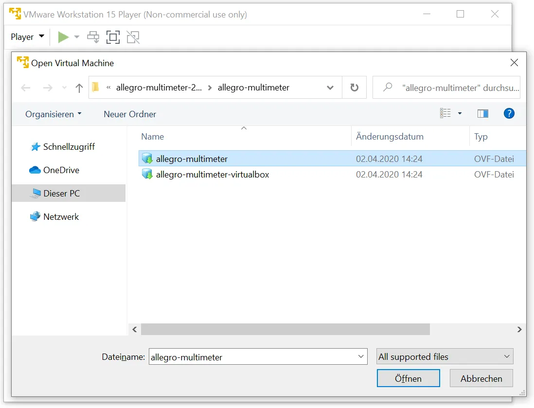 Import the VM with Open Virtual Machine and select the allegro-multimeter.ovf file from the extracted Zip archive.
