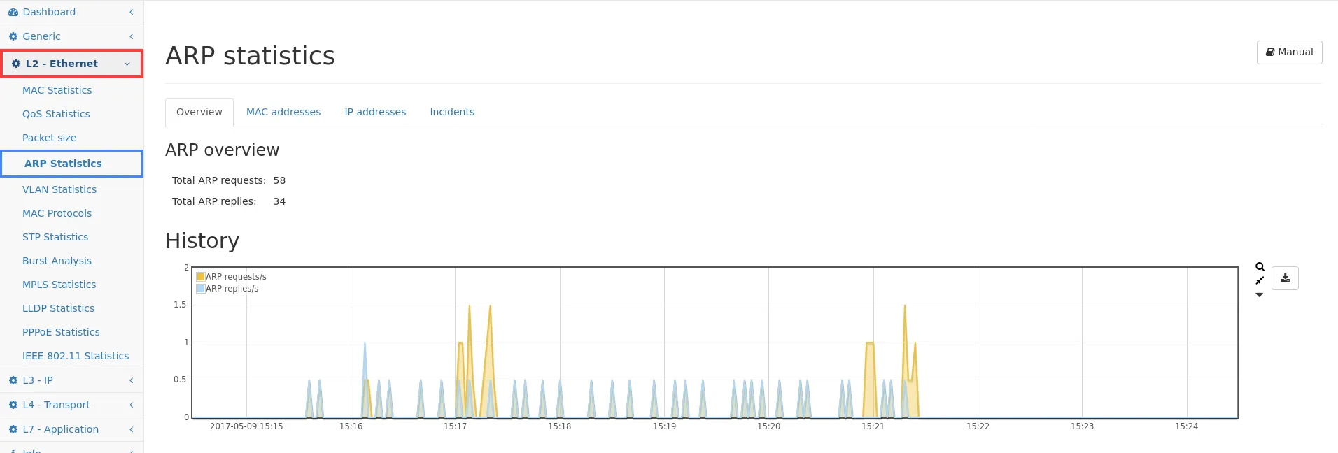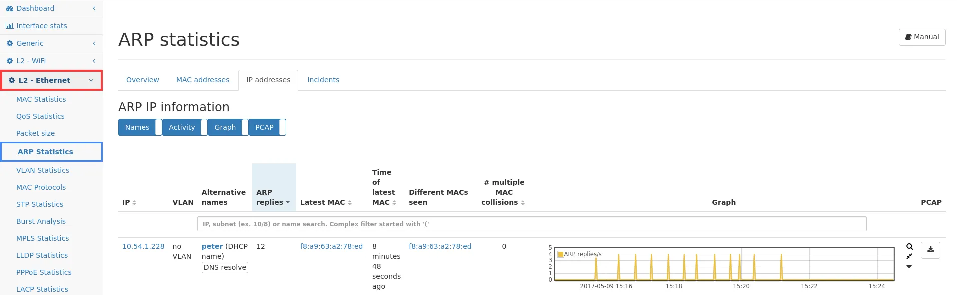 The Address Resolution Protocol (ARP) is used on layer 2 to track which hardware (MAC address) uses which IP address. The ARP module monitors requests and replies and builds a database of all known MAC and IP addresses and their correlation. It also accounts possible spoofing alerts, when some computer send or reply with wrong MAC addresses, or multiple computers answer with the same IP. Those events may indicate some problem within the network, due to misconfiguration or an attack.
