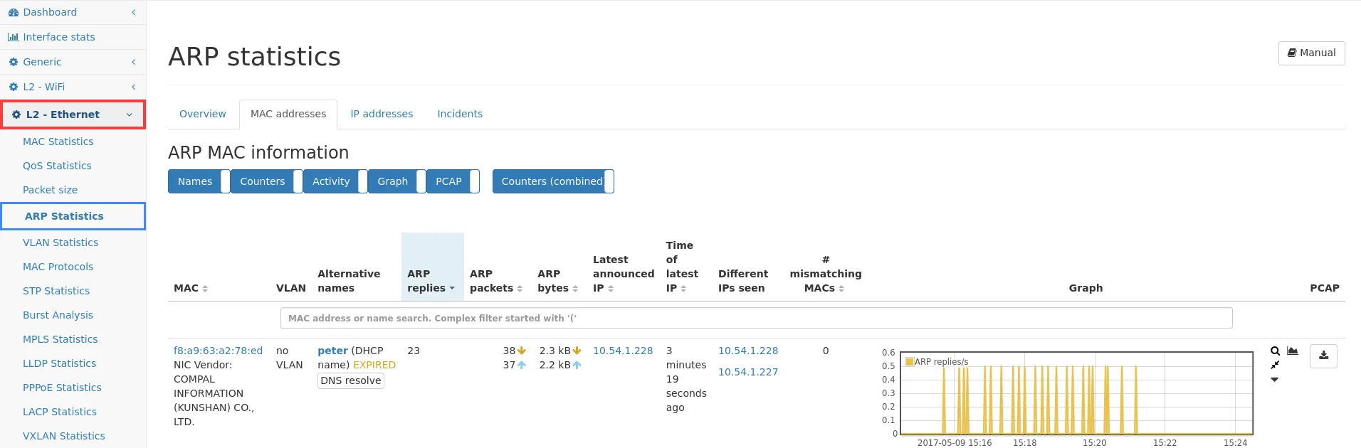 The MAC address tables shows for each MAC address the last assigned IP address, that is the IP address that has been announced by the corresponding MAC address. The time when this IP address has been announced is shown as well. The table includes the alternative names from other sources (such as DHCP, DNS, TLS, HTTP, etc) of the last IP. The column Different IPs seen lists all IPs that have been announced by the MAC address at some point in time. Many devices will just have a single IP, but when dynamic IP assignment is done (via DHCP or other methods), multiple IP addresses are as well possible. The column # mismatching MACs contains a counter about the number of possible conflicts in requests or replies. The counter increases when there is a mismatch of MAC addresses used in requests or replies (a different MAC address has been announced as sender than the actual packet was sent by). The value should always be zero, otherwise it indicates that a devices sends ARP request with a forged sender address.