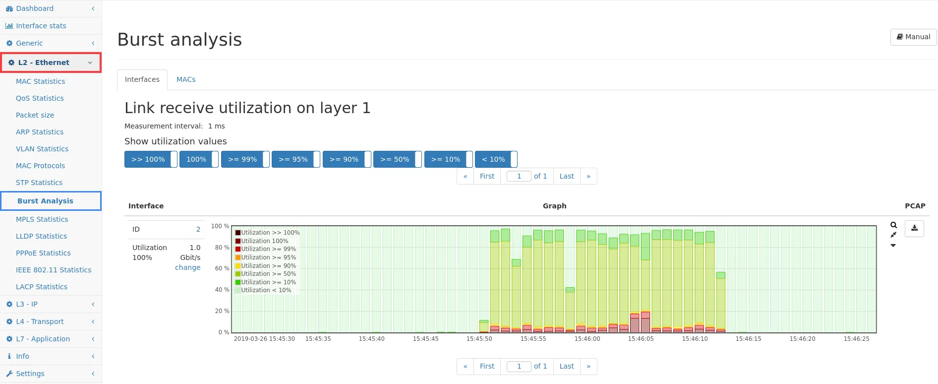 Section titled “Measurement”The burst analysis module measures throughput for every interface in a 1 ms interval. Measurement is always done on layer 1, the packet length accounting setting is ignored.