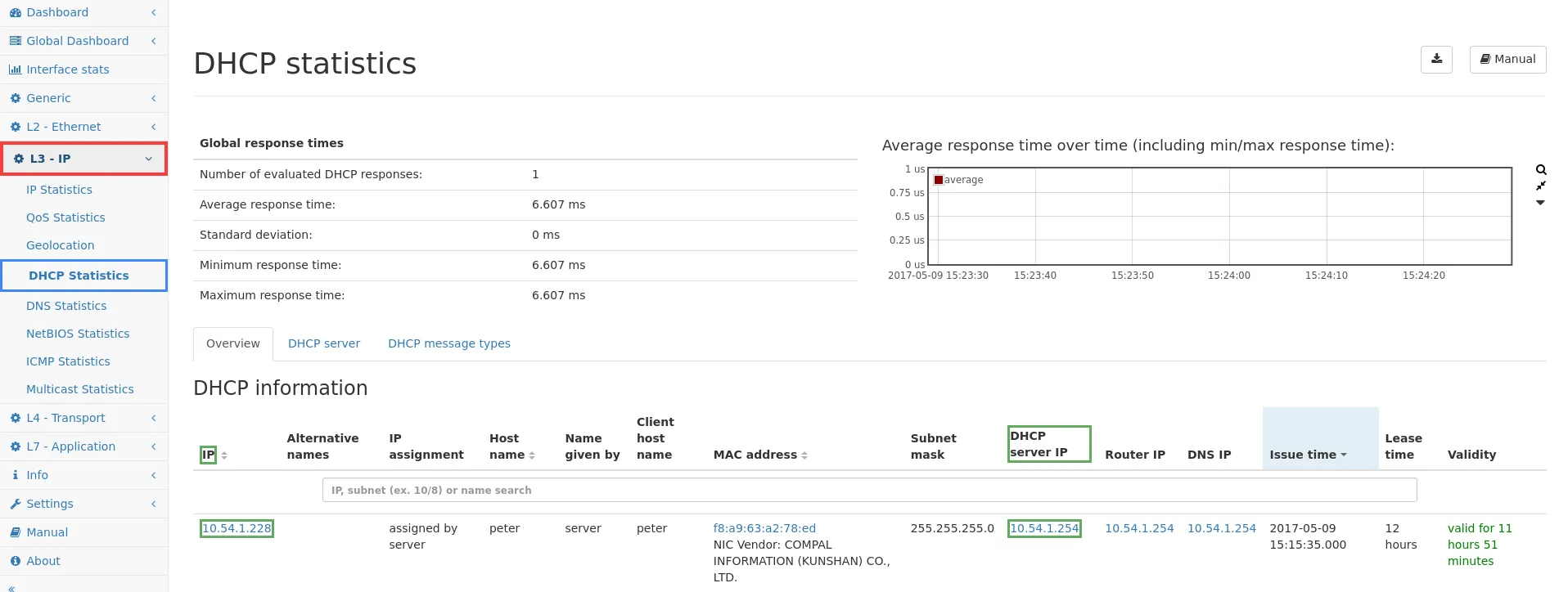 The DHCP module tracks requests and answers for dynamic IP assignments in networks. This allows to resolve self-announced system names to actual IP addresses. Also, the module gives an overview about running DHCP servers in the network, allowing to identify problems with IP address assignments.