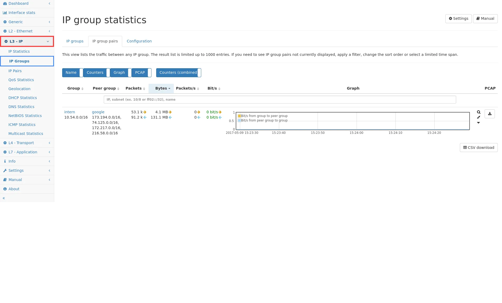 Section titled “IP group pairs”This page shows statistics about all IP group pairs that had traffic with eachother. Only 1000 entries can be displayed at any time. If there are more pairs, consider setting a filter to see the other IP group pairs.
