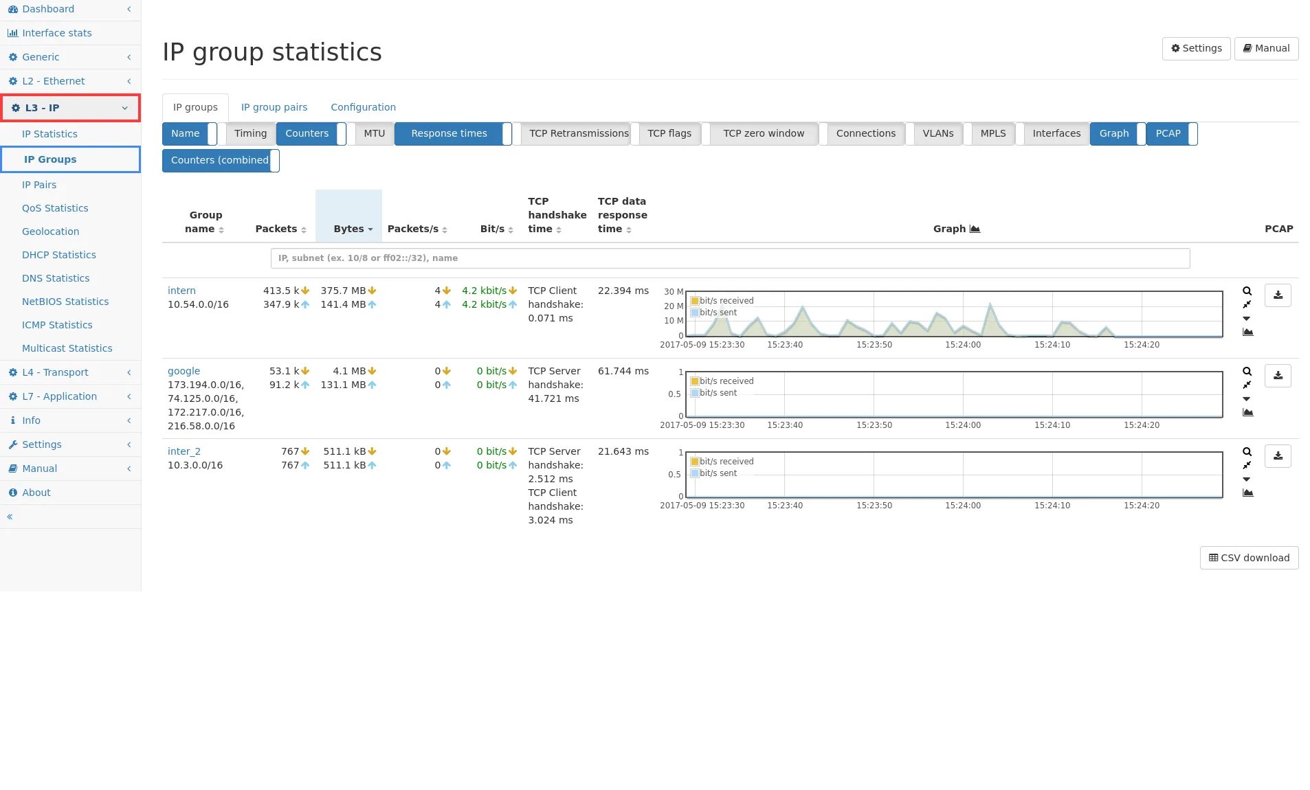 The IP statistics can also be summarized for a group of IP addresses. This is useful for getting an overview of the traffic of a specific part of the network, for instance all servers or client PCs. Any IP subnet can be configured to be used as a group and the statistics will then show the amount of traffic for all IP addresses within the subnet, its peer addresses, etc. Multiple IP groups can overlap so that an IP address is part of multiple IP groups. When Virtual Link Groups are defined, the IP group is accounted separately for each Virtual Link Group.