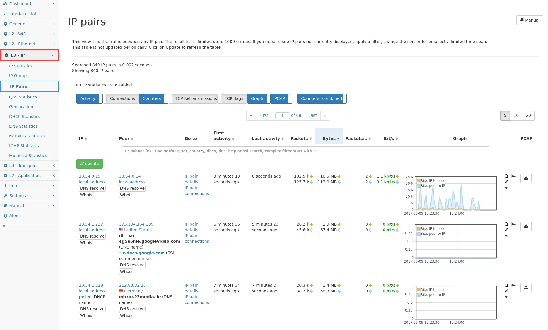 The module iterates through all IP addresses and their peers and gathers the top 1000 elements according to the active sort and filter parameters. The list always only contains up to those 1000 pairs, but any complex filter can be used to see elements which are otherwise not visible.