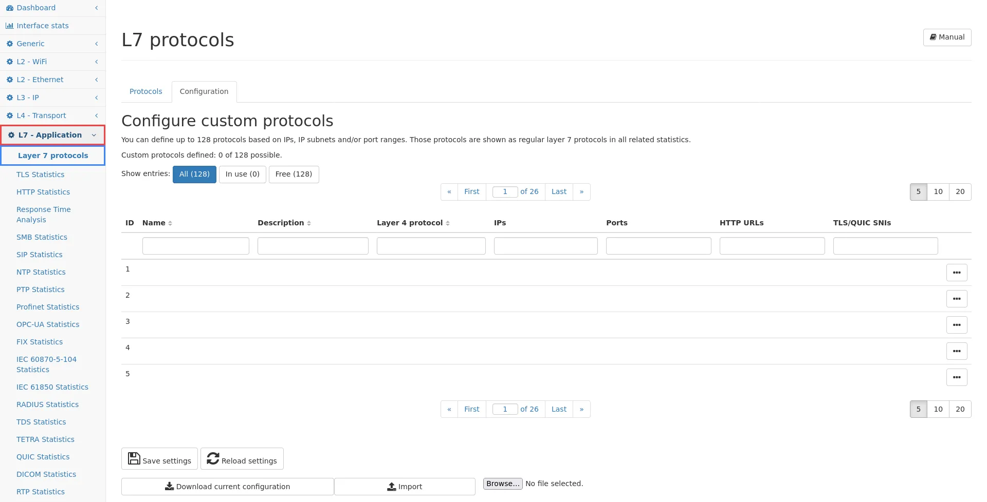 The configuration tab allows to define additional custom protocols. Based on IP addresses or subnets, port ranges or URLs, up to 128 different custom protocols may be defined, which are shown as regular layer 7 protocols in the statistics described in the previous sections. These custom protocols can be used to track specific services or IP addresses. It is also possible to capture traffic specific to those protocols or define filters.