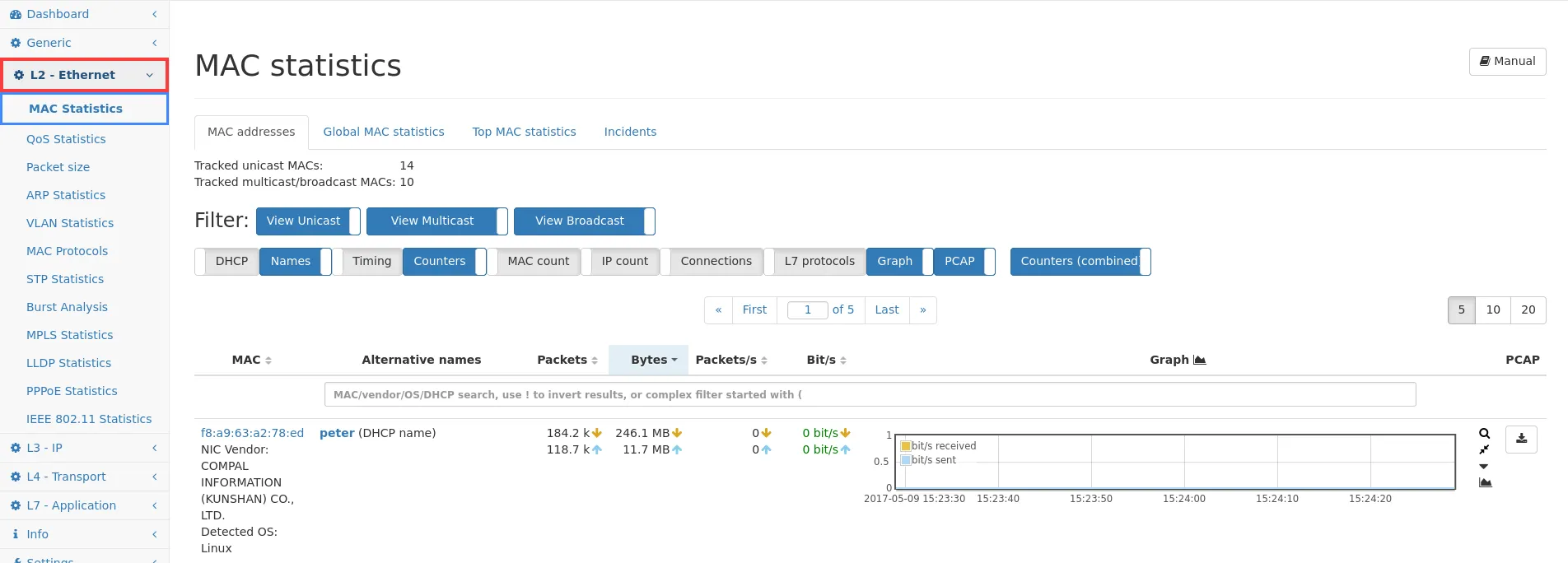 The MAC module operates on layer 2 of the network stack. It stores information about all MAC addresses. For every address, the corresponding network traffic is accounted, the used protocols and their individual traffic. The communication MAC peers are stored as well as the traffic between both MAC addresses.