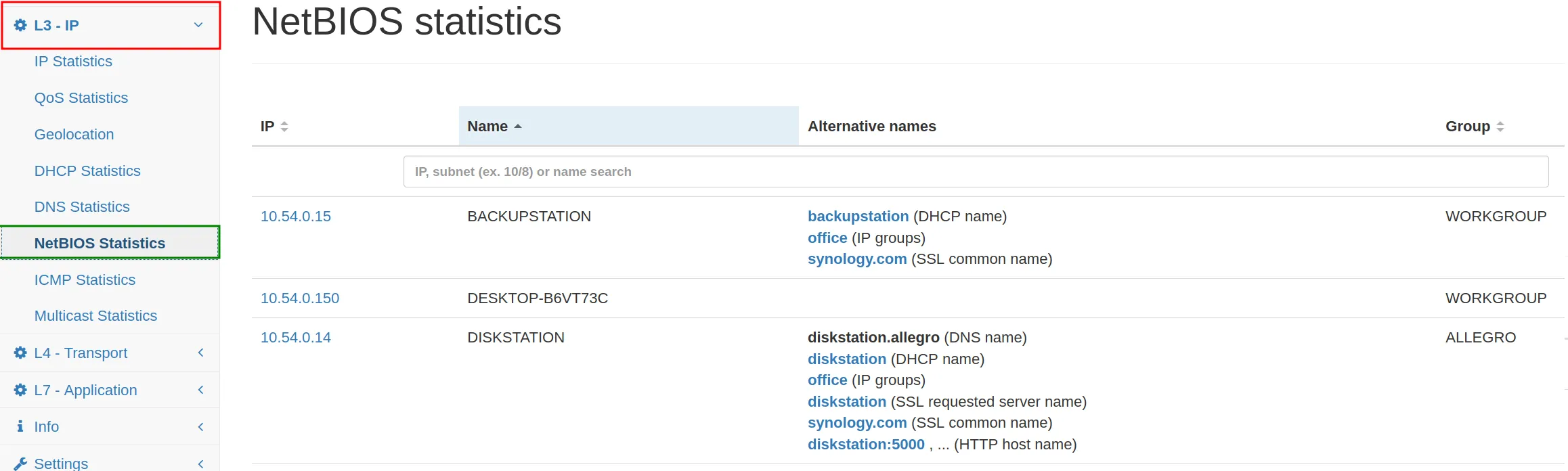 The search bar allows to filter for a specific IP or name.