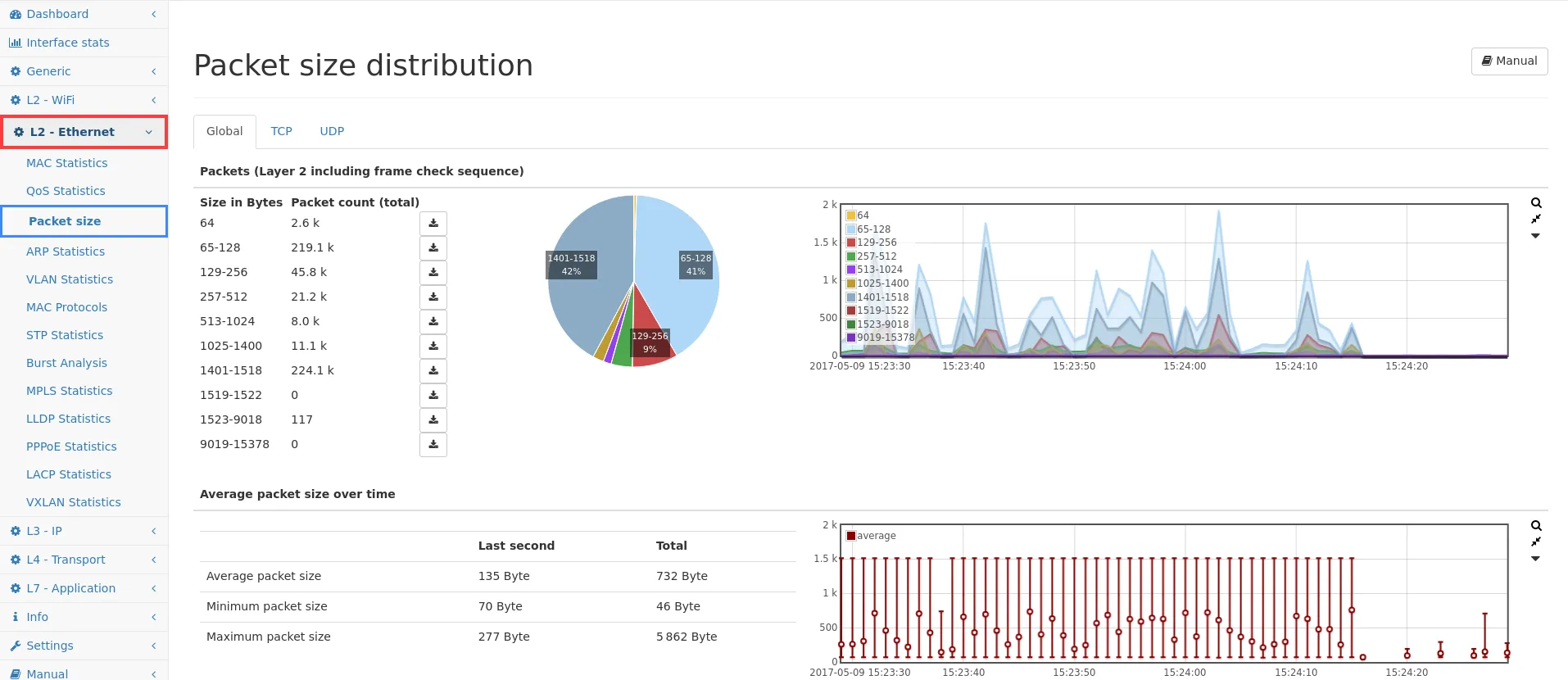 Statistics are available for the whole traffic as well as for TCP and UDP only.