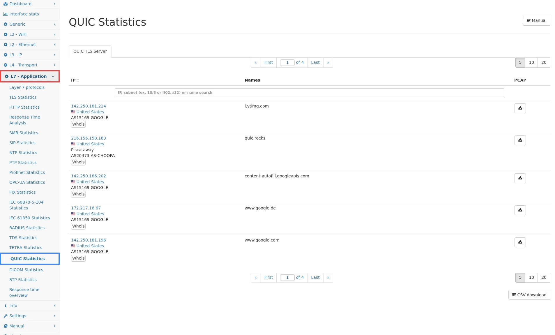The QUIC TLS Server tab presents a comprehensive overview of all QUIC server IP addresses that have been requested by a client along with their corresponding server names. This data is extracted from the server_name extension of the TLS client hello, which is present in the QUIC initial packets.