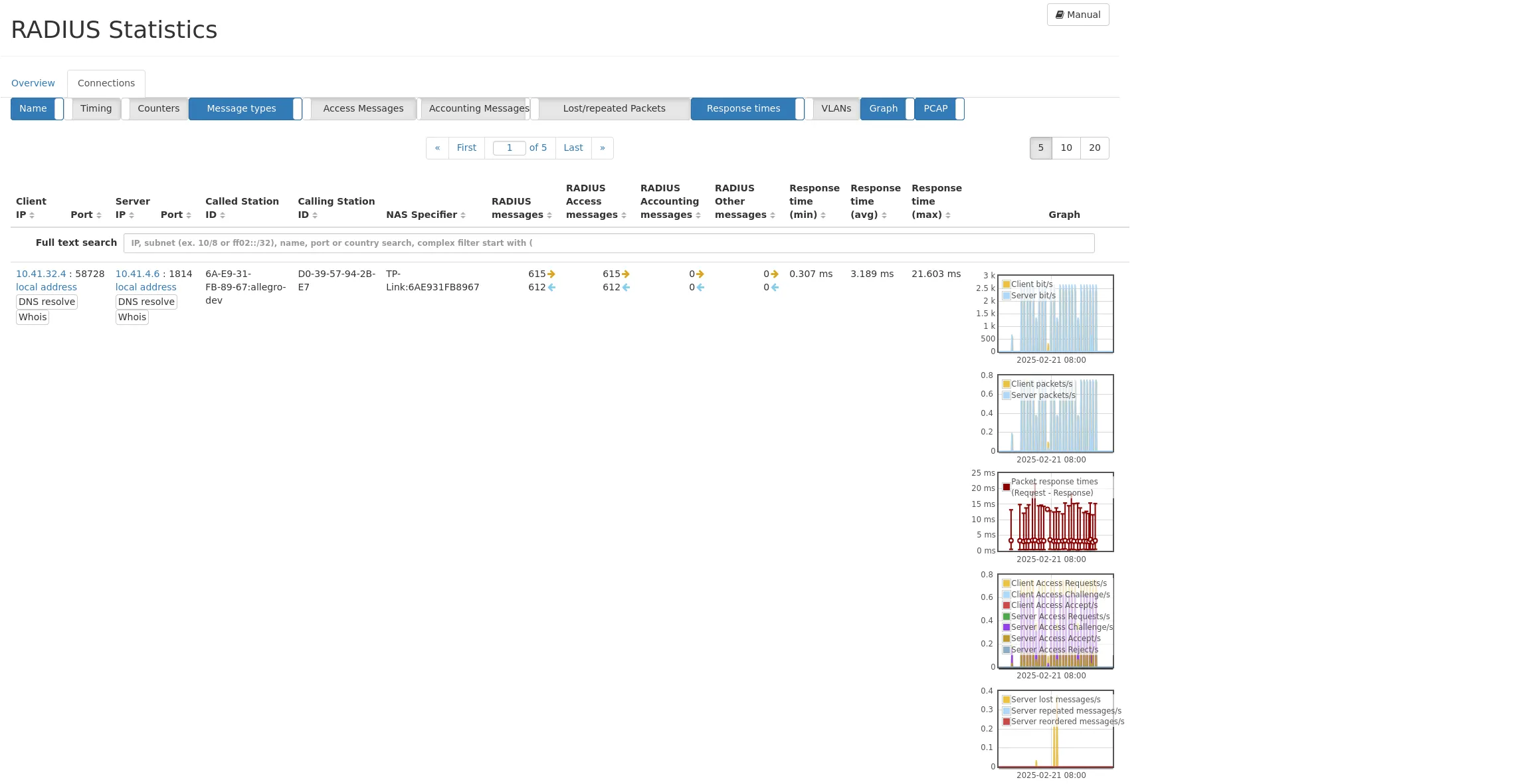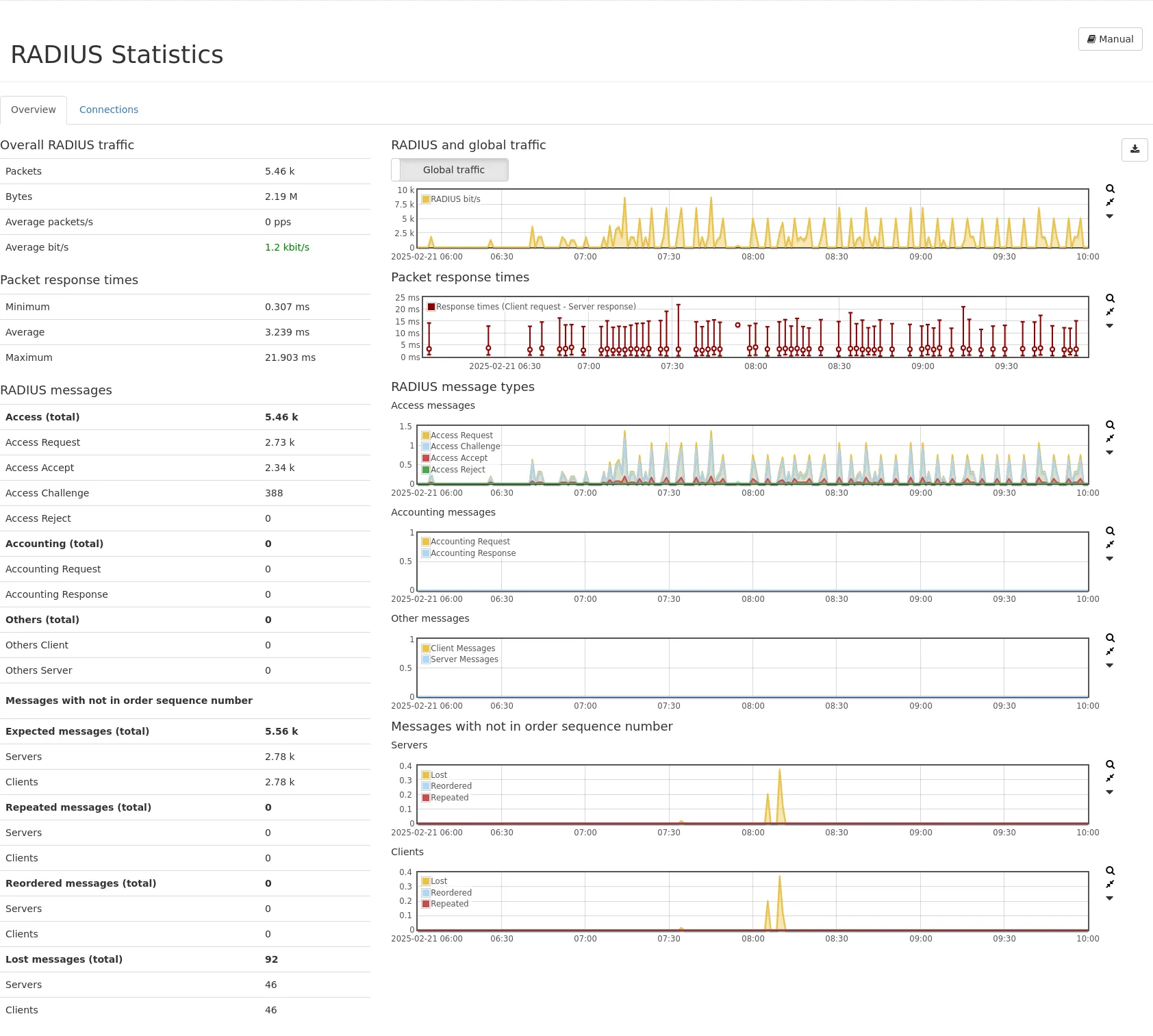 Information about all RADIUS packets are shown as values and graphs to give a quick overview. Global traffic can be shown in the traffic graph to see the share of RADIUS on the overall traffic. A PCAP download button allows capturing that traffic.