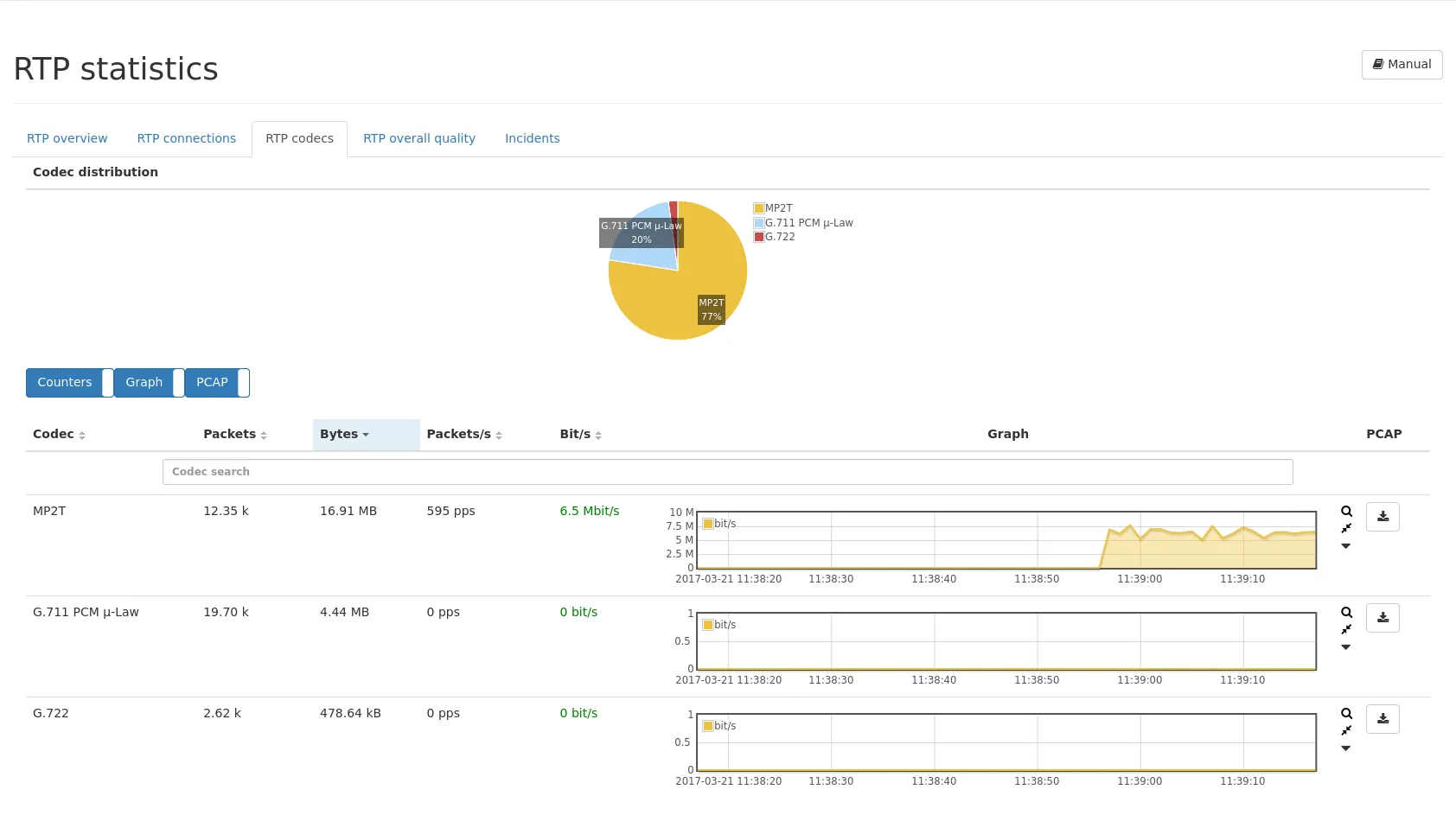 Graph: The graph column shows the history graph of the traffic for that codec. It shows the timestamp on the x-axis and the bytes on the y-axis. The resolution can be changed by using the control buttons on the top of the web page.