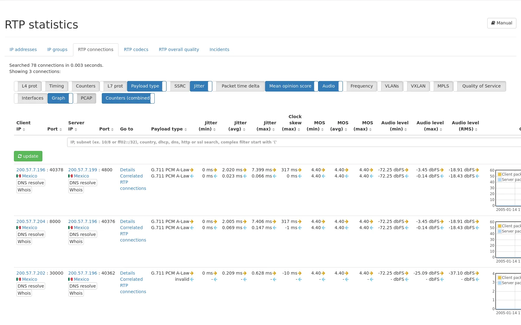 Graphs per connection can show packets, packet loss and packet duplication, bit rate, jitter, packet time delta, MOS and the max audio level of client and server over time. A PCAP button allows for PCAP capturing.