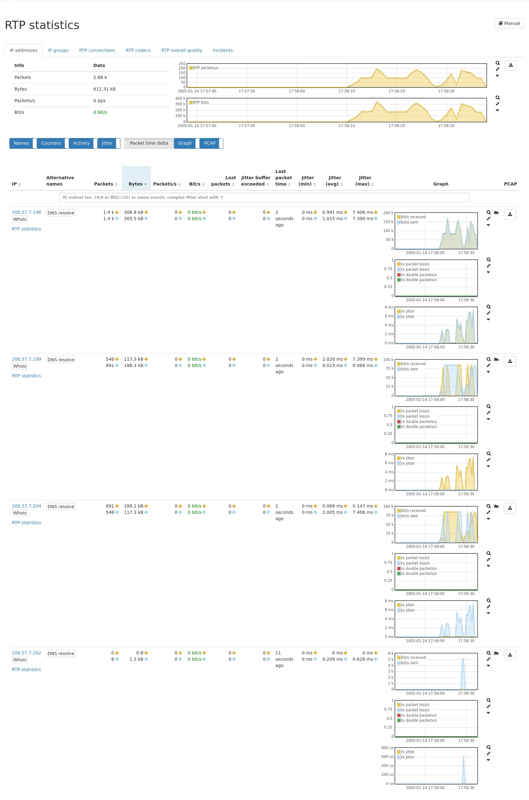 Section titled “RTP connections”This tab shows statistics (if available) of all RTP connections.